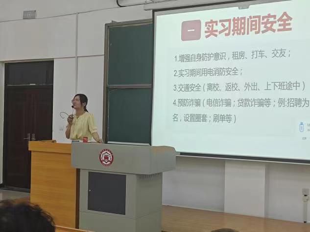 第五项,曹琳珊讲解实习管理制度,开展实习期间安全教育。她提醒同学们要增强自我安全意识,对于租房、打车、交友等方面要提高防范意识,谨防诈骗。