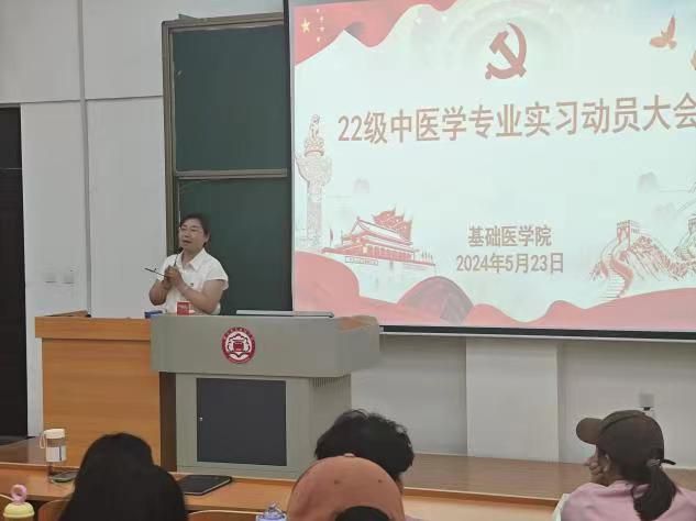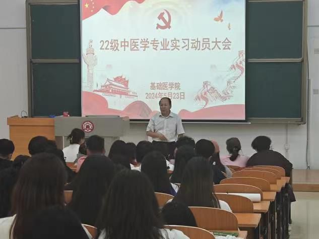 为了增强中医专业学生的专业素养和技能水平,提高助理医师的职业认同感和荣誉感,让同学们更加明晰了解助理医师资格证的考试相关内容和学习途径,并圆满完成2024年学生岗位实习工作。5月23日,yl23455永利官网在4-207教室为22级中医学专业学生开展助理中医师资格证考试暨实习动员大会。yl23455永利官网院长赵印震、党总支书记崔颜宏、副院长杜学利、学工办主任曹琳珊、教学办主任牛小艳出席会议,22级中医专业辅导员及全体学生参会。